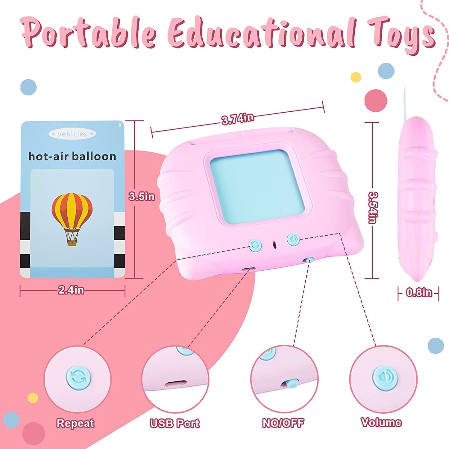 Flashcards are made with heavyweight cards, smooth edges, colorful paint. Safety for children. Size of the flash card reader device is 4.21x3.54x0.83 inch, perfect hand-held size for toddlers. Small size and easy to carry. No need for WIFI, clear spoken language with intuitive and interesting pictures, easy to learn anytime, anywhere The machine is made of ABS material, which is durable and smooth to prevent breaking.